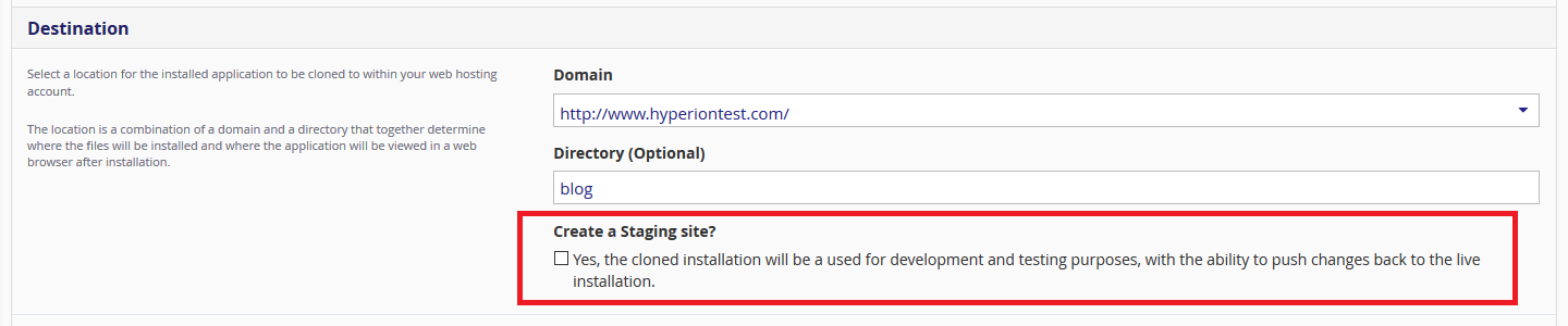 Here select the domain/sub-domain you wish to install your staging site under. You should then toggle the checkbox under “Create a Staging Site?”
